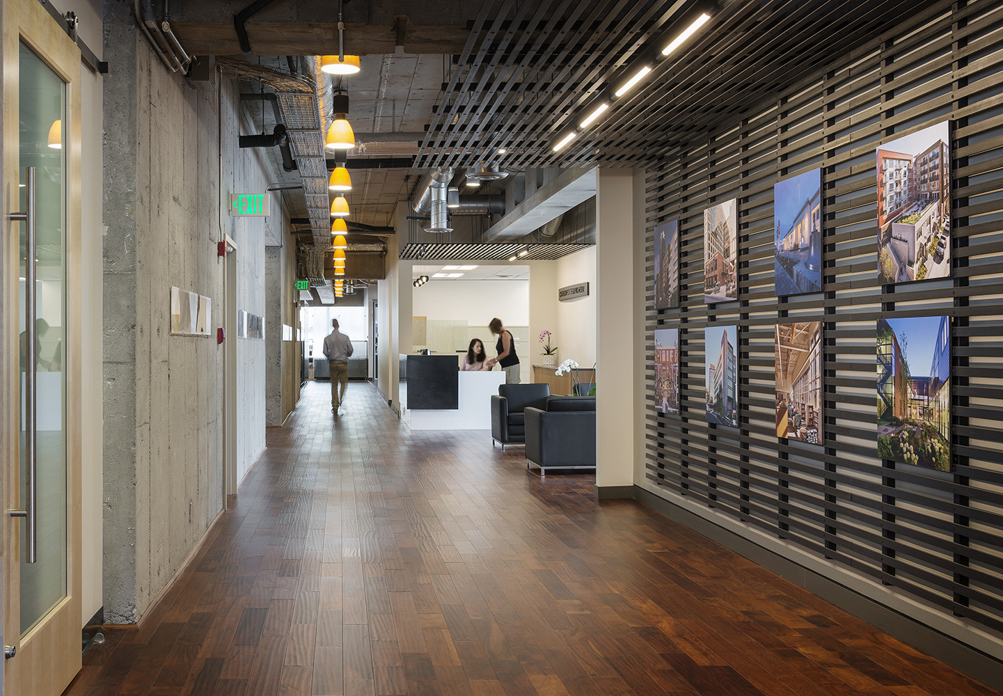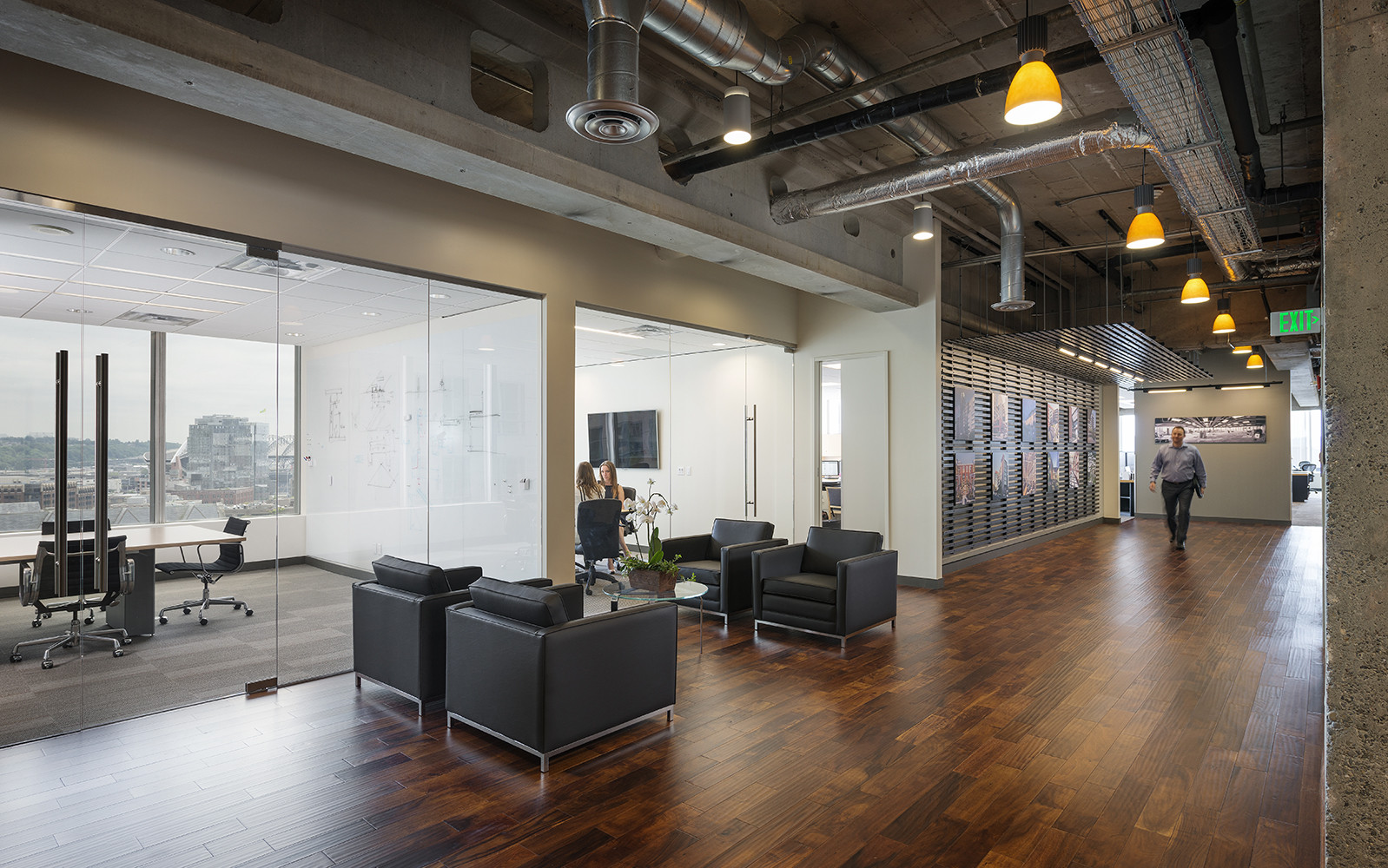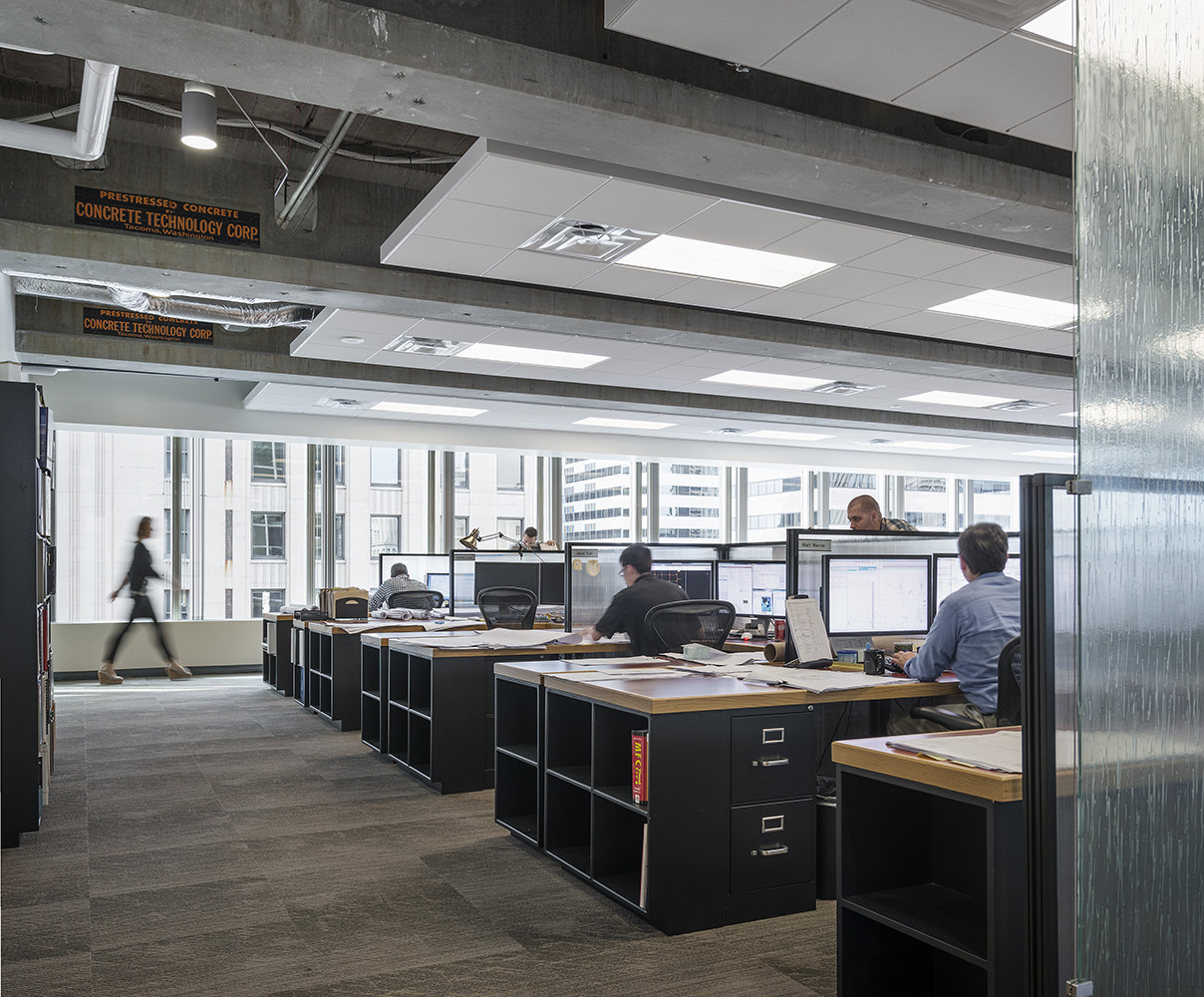 The building of this engineering office project was distinctive for its 70-foot-clear spans of pre-stressed concrete beams, a condition more likely found on freeway overpasses than inside commercial office buildings. Our design highlighted this unique concrete structure and emphasized its industrial feel in order to give the client a space aligned with their professional art. Warm contemporary materials were used to accentuate the depth and richness of the structure's existing modern colors and textures. The open office environment - possessing a balance between the past and the present - provides an inspiring workspace for its employees to thrive in.