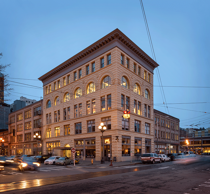 The Furuya Building and Corgiat Building were combined to create a single development in Pioneer Square. The Furuya Buidling was originally constructed for the Snoqualmie Power Falls Co. as a two story structure. Five years later it was increased to five stories and converted into a bank and office building. In the 1940s the top two floors were removed after an earthquake. The Pacific Commercial Development's goal for this project was to add two stories back, while seismically upgrading and providing new infrastructure. The fourth and fifth floor facades were replicated based on old photographs and existing materials. New existing facilities and a new elevator were included in the renovation. Today the building stands at its full height, as it did 100 years ago, on the corner of 2nd Avenue and Main Street in Pioneer Square. The structure is registered with the National Register of Historic Places.