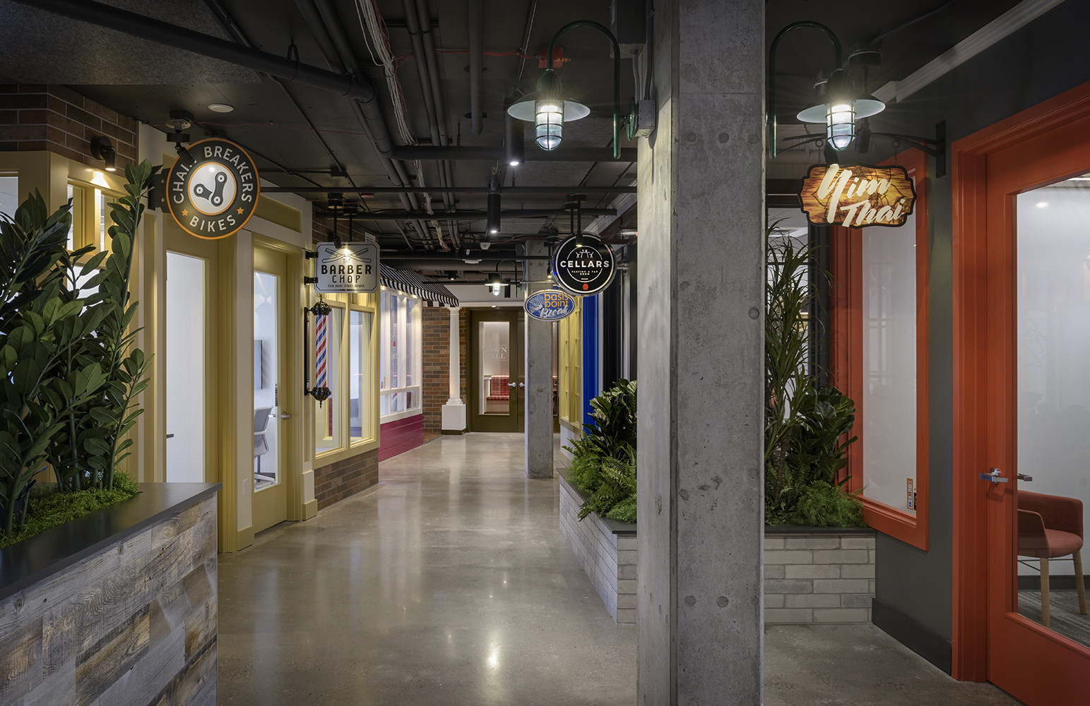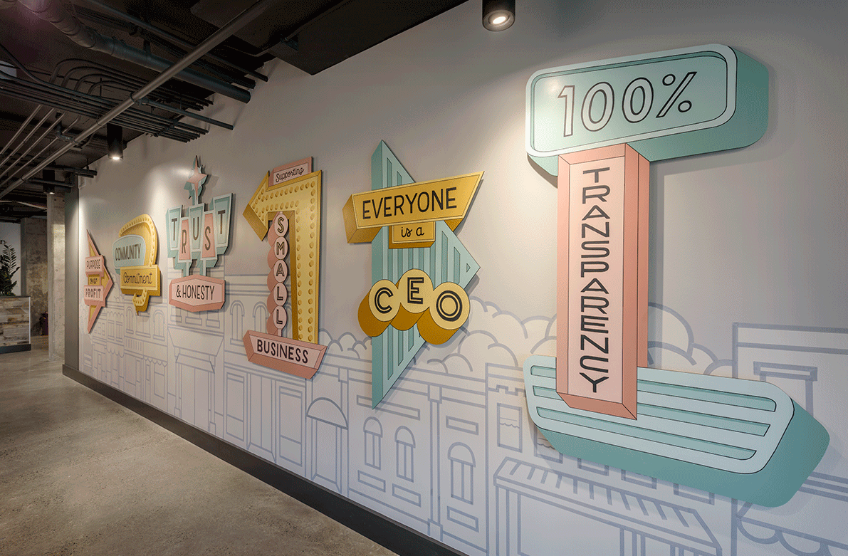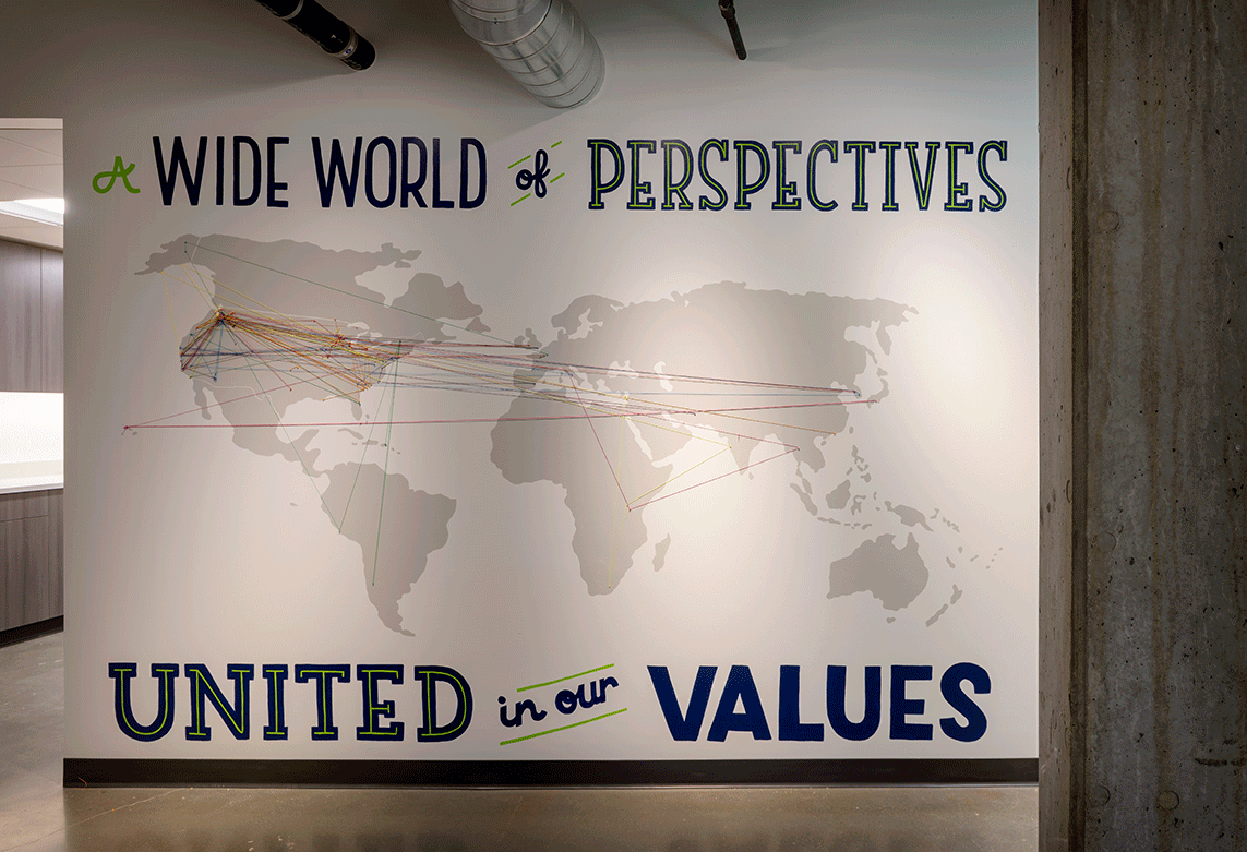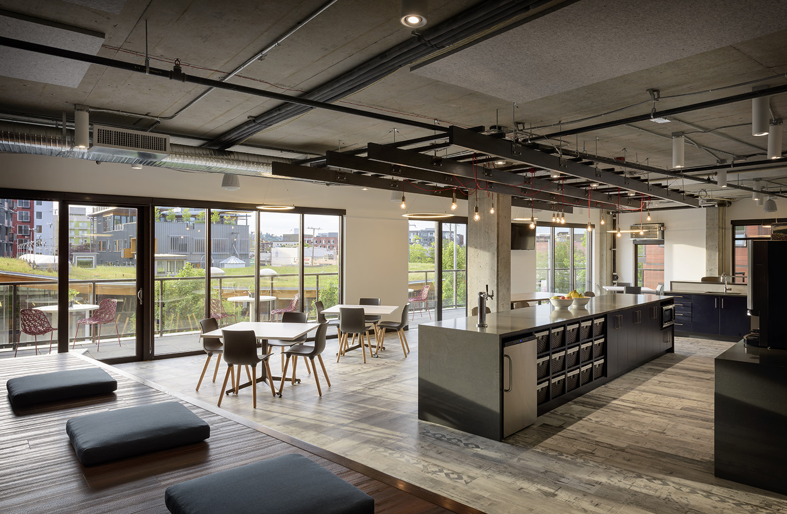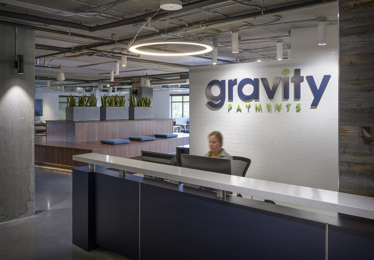 Occupying two floors of The Commons in Ballard, the Gravity Payments headquarters is meant to pay homage to Main Street, U.S.A. The space is a reflection of the tech company's mom-and-pop retail customer base and also of the energetic, social, creative staff that serves them. Upon entering the reception area, employees and visitors alike are greeted with an open-floor-plan concept and exterior views of the neighborhood. The reception area's proximity to the all-hands and amenity spaces reinforces the connection between employees and clients of Gravity Payments.