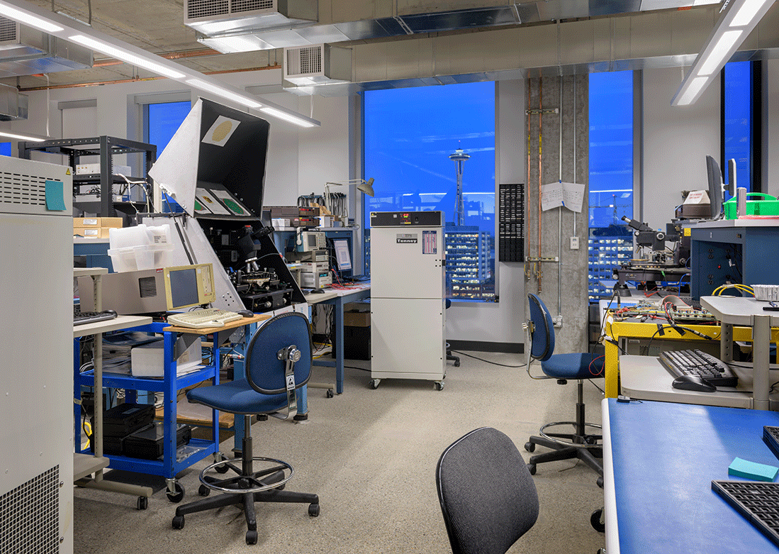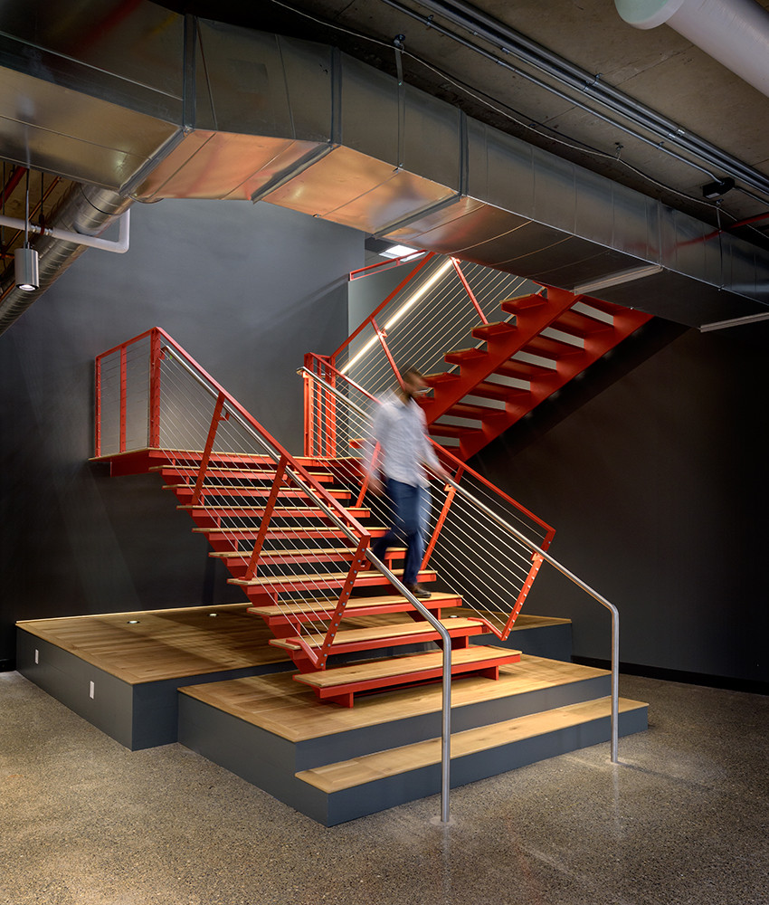 A company as complex as Impinj requires a headquarters capable of multi-function efficiency. The 52,000 square-foot space over three floors includes office space, a dry laboratory, areas for research and development, and a retail experience space. The office space is a mixture of stand-up collaboration areas with writeable walls, semi-enclosed banquette seating, small meeting rooms, mid-sized conference rooms, and lounge spaces. The combination of which provides flexible options for a range of activities. Extensive planning and coordination were required to meet the infrastructure needs of the laboratory and research and development teams. Throughout the space custom work such as wood-cladded walls, glass-inlaid casework, and a wood ceiling system contribute to a look and feel that reflects the culture of Impinj.