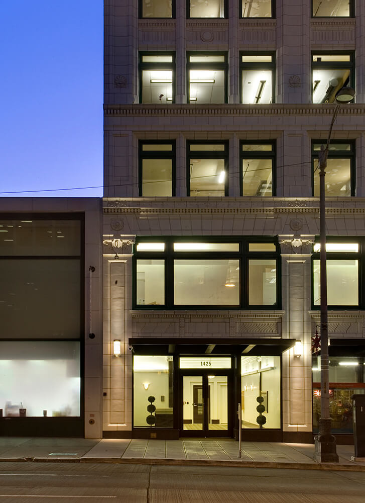 The Joshua Green Building is registered as a historic landmark in Seattle. Our renovation work began in conjunction with the 10-story building's 100-year anniversary and included a seismic retrofit, demolition of existing tenant spaces throughout, and the construction of a new utility and restroom core, exit stair, and non-primary windows. The west façade was reconstructed and window configuration was modified to maximize the views of the Puget Sound and to increase energy efficiency. A complete seismic retrofit, as well as new mechanical, electrical, and life safety systems, were included in the scope of work. Storefronts on the ground level were replaced with dramatic steel-and-glass canopies, and a new rooftop deck was added for tenant usage. Our work was recognized as a "Best Rehabilitation Project" at the 2013 Historic Seattle Preservation Awards.