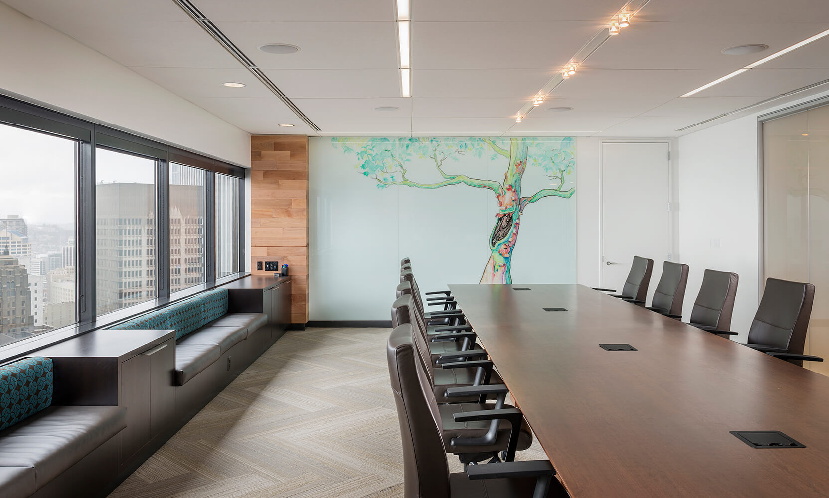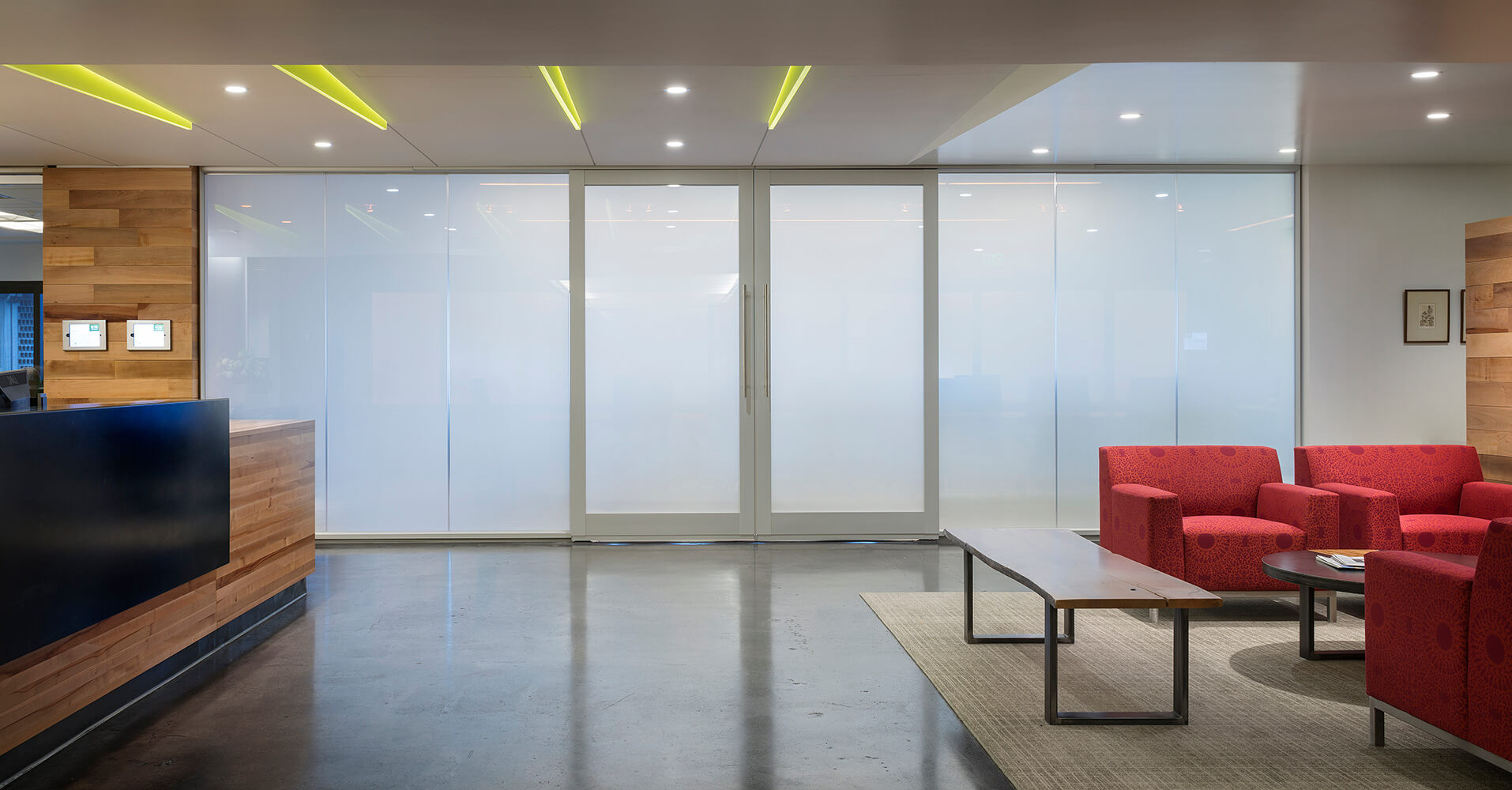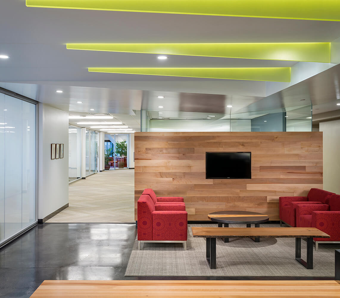 Madrona Venture Group’s vision was to shed the image of a traditional financial services firm and create a modern environment that draws inspiration from their company name and logo – the madrona tree. The entry area draws inspiration from the tree's appearance with a warm wood feature wall and light, airy, ochre acrylic blades in the ceiling. Madrona wood is featured throughout the space with accents of red representing the madrona berry.