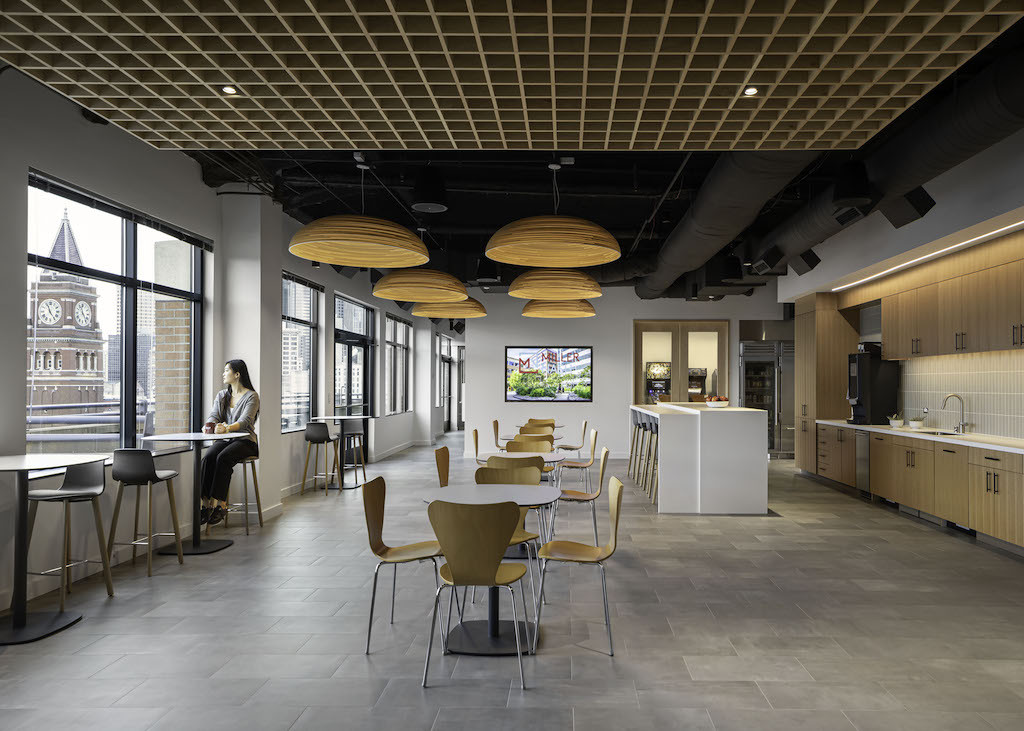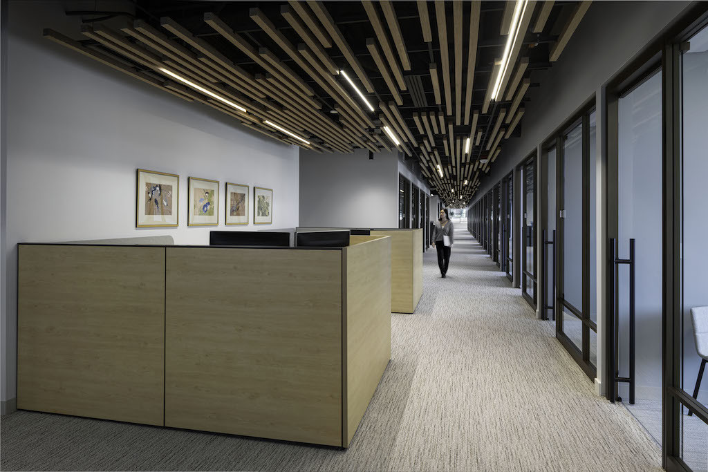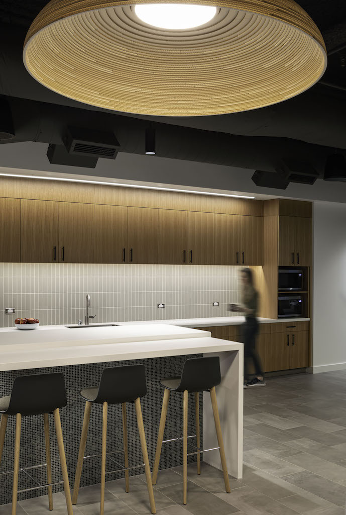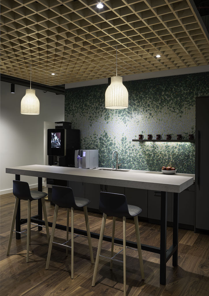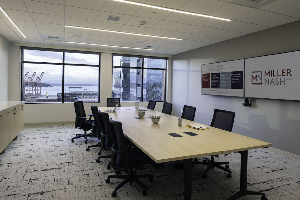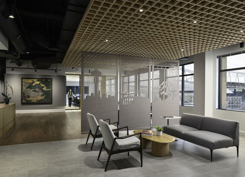 Miller Nash sought a move from their long time location on the Waterfront and arrived in the heart of the International District. Encompassing the top floor of the building the total space is 24,600 square feet and includes exterior decks over Lumen Field and views towards Elliott Bay. While private offices wrap the exterior of the floor, the west side of the space was created for client meeting, gallery, common open cafe area and gathering space. The interior finishes reflect quiet sophistication with a nod towards northwest warmth. Open ceilings throughout the common area are enhanced with wood clouds and acoustic striated ceiling treatments.