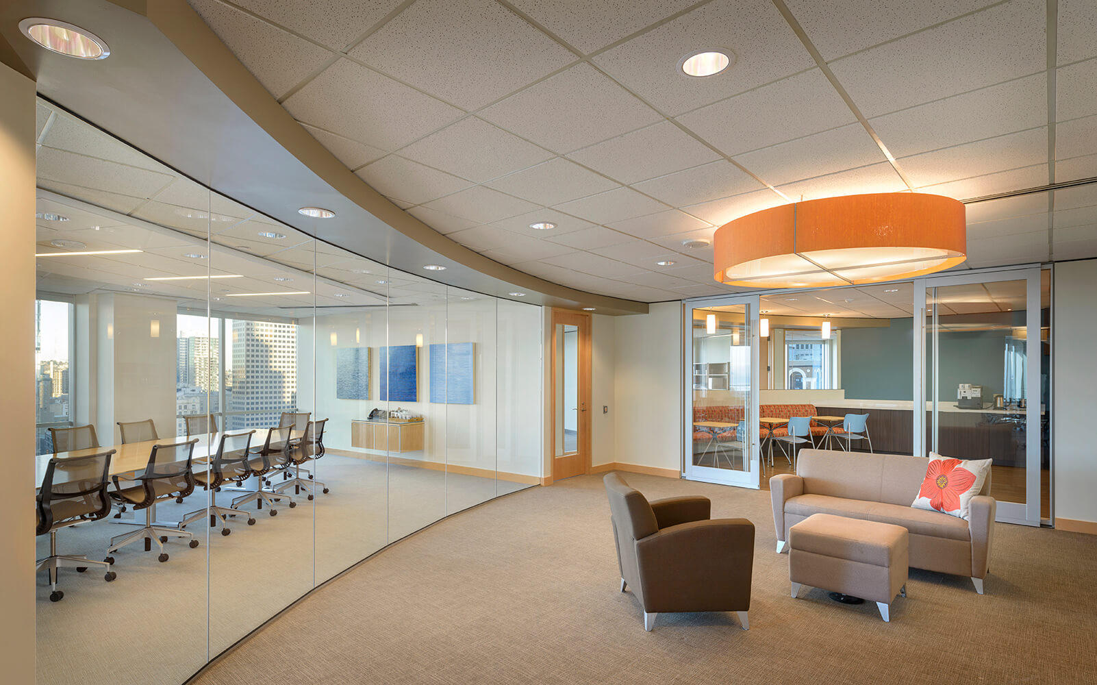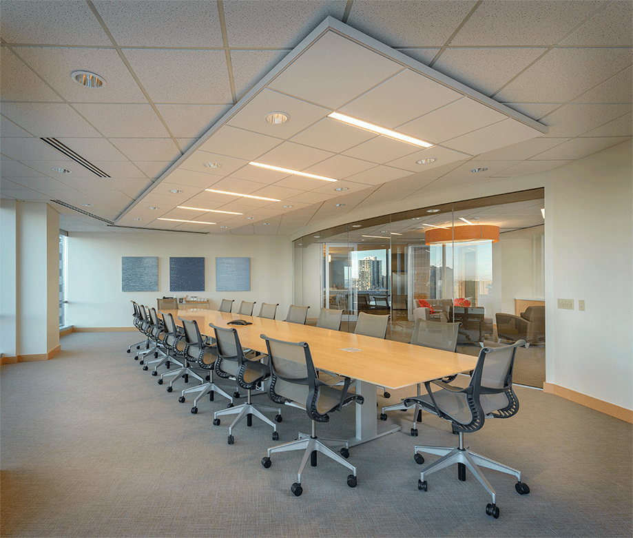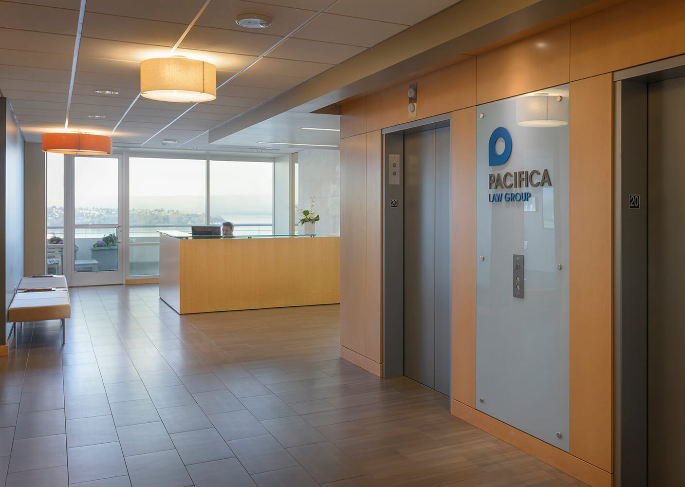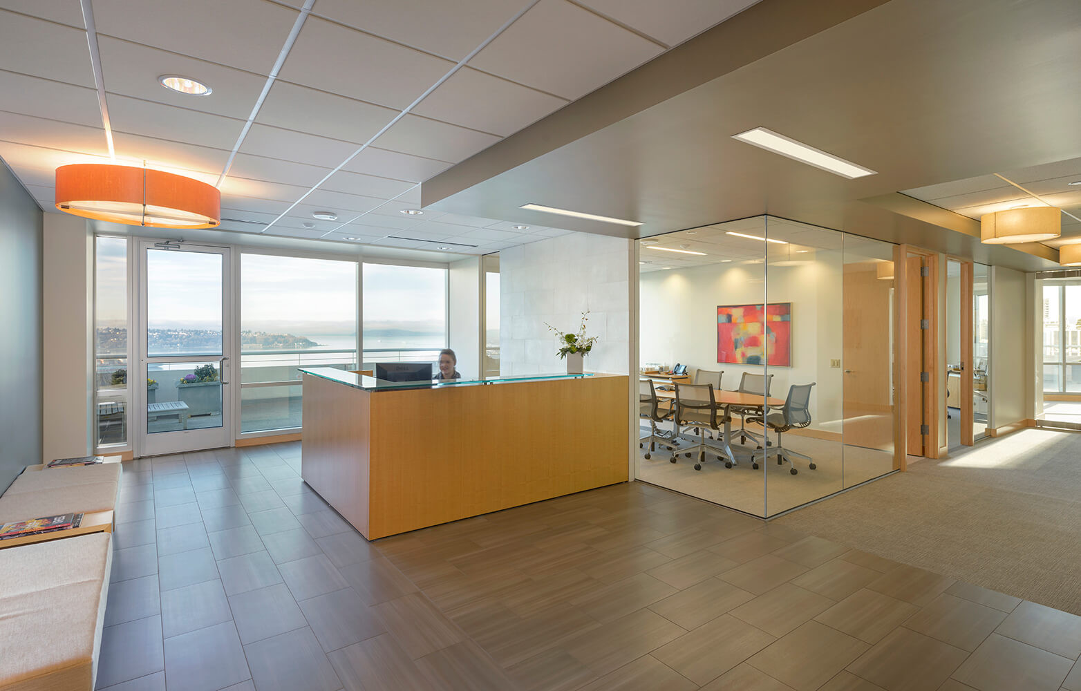 An overarching goal for project was to provide a light, airy feel to this law firm's two-floor office downtown. Locating public areas so that employees would have direct access to the rooftop patio and proximity to the internal communicating stair influenced the floor plan. It was important that the client would have secured separation between public and private space within the office, since they often host events after business hours. Simple lines within the space's design are meant to give way to the external views of the Puget Sound and the Olympics. Because our work involved expanding the office suite, materials were consciously chosen to bridge the gaps between the existing suite and the new space.