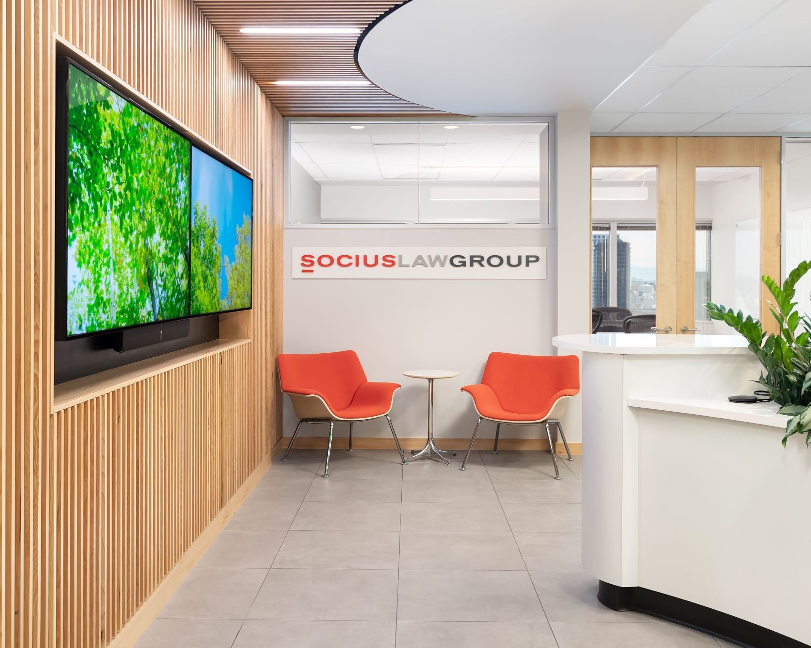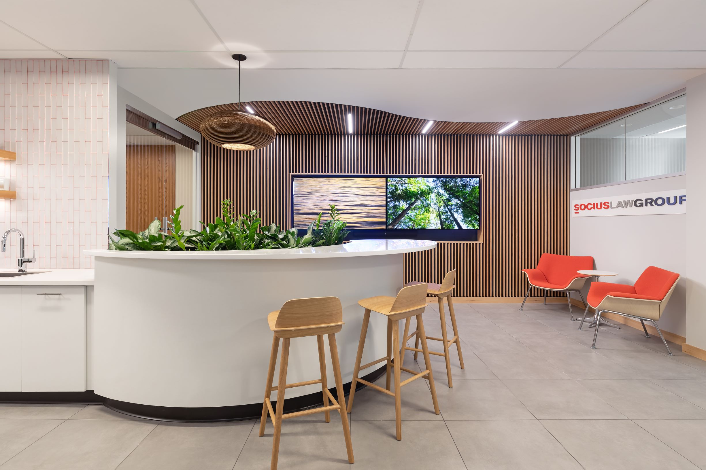 Socius Law is a law firm located in Downtown Seattle. Seeking a unique entryway that transcends the typical design, Weaver crafted a curvilinear, asymmetrical entrance that directs visitors inside. A wood wall welcomes users while doubling to serving as a branding feature for the tenants, immediately engaging guests to both the space and company. This walkway continues, following the flowing curves of the ceiling and island, ultimately leading to a cozy coffee area, creating an inviting and remarkable experience.