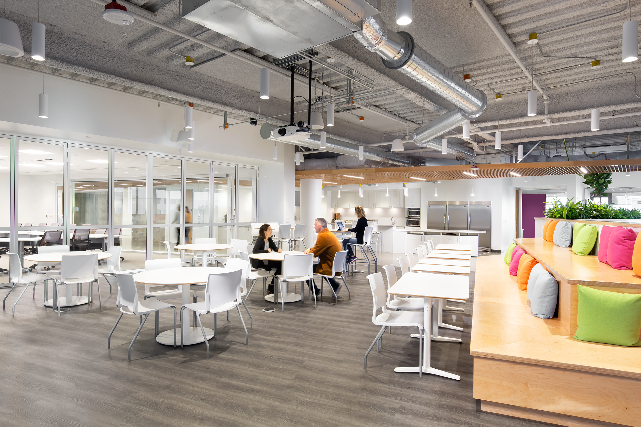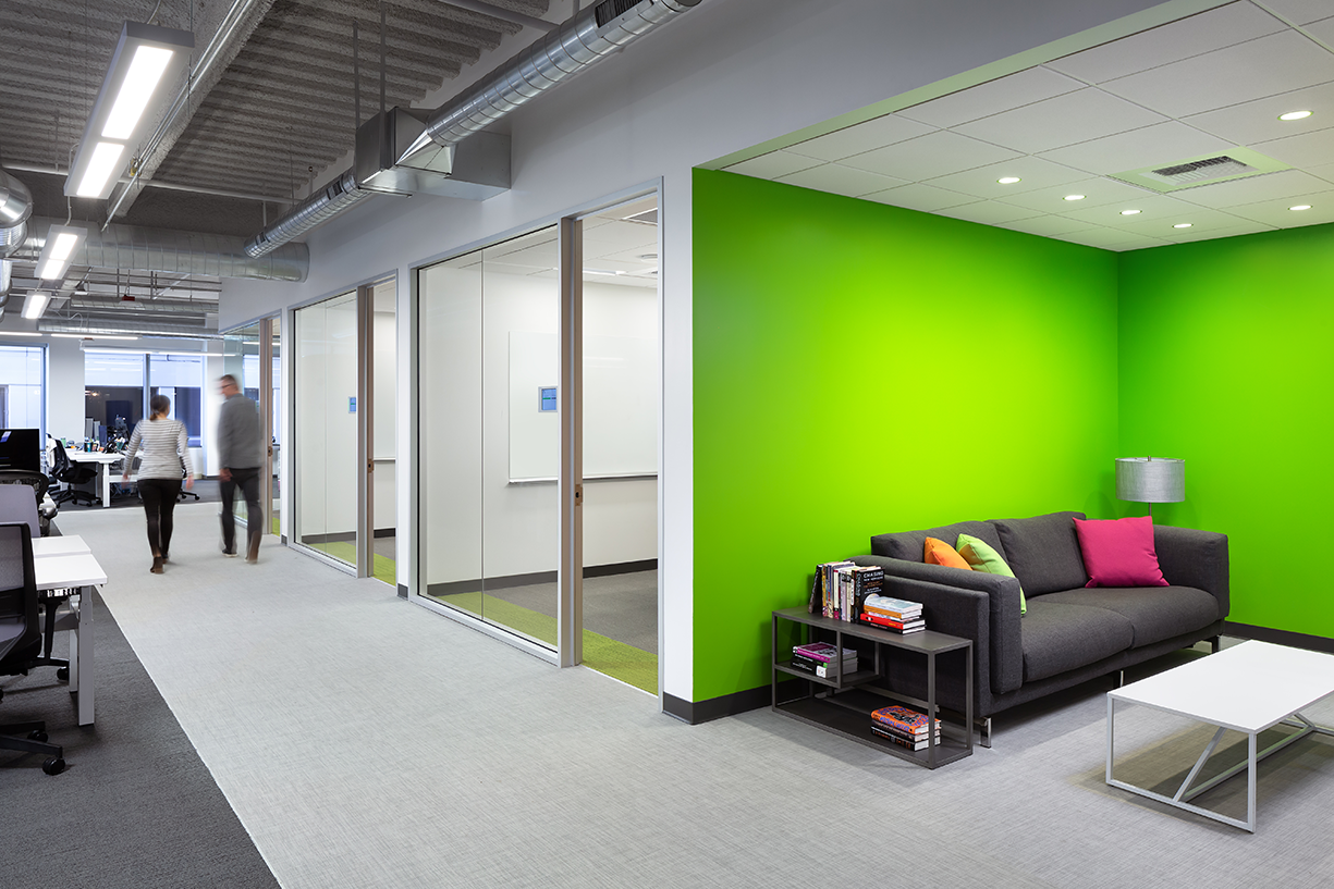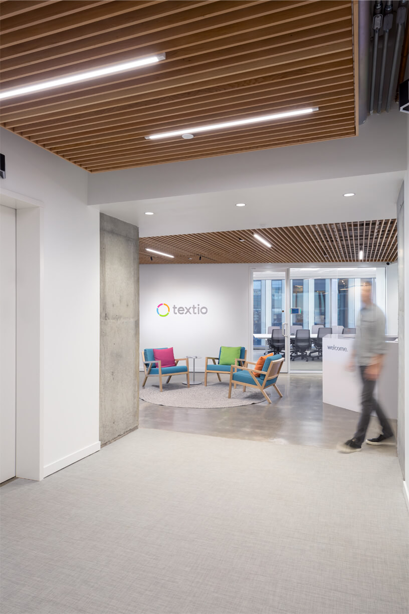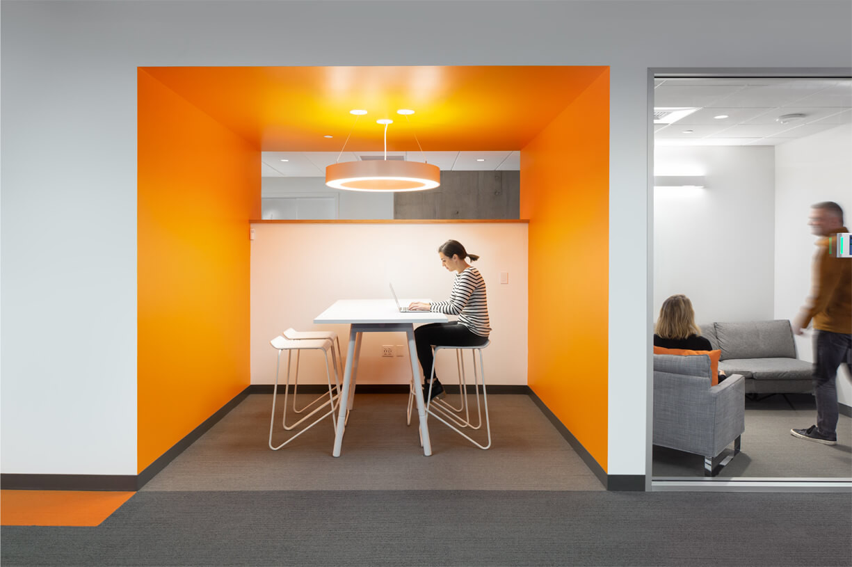 Textio’s office is a sophisticated and modern space featuring a clean and sleek neutral palette with vibrant accents that are found in the tenant's branding colors. These pops of color create focal points and help define various areas. The office includes multiple huddle spaces, each draped with color to foster creativity. These secluded gathering spaces enable employees to converse, collaborate, and let their creative energies flow freely.